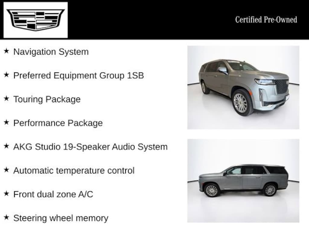 Certified. CARFAX One-Owner. Argent Silver Metallic 2024 Cadillac Escalade ESV Premium AWD 10-Speed Automatic 6.2L V8 Escalade ESV Premium, 4D Sport Utility, 6.2L V8, 10-Speed Automatic, AWD, Argent Silver Metallic, Parchment With Jet Black Accents Leather, 16.9 Diagonal OLED Infotainment Screen, 2-Presets Memory For Driver Seat Adjuster, 3rd row seats: split-bench, 4-Way Power Front Passenger Lumbar Seat Adjuster, Adaptive Cruise Control, Air Ride Adaptive Suspension, AKG Studio 19-Speaker Audio System, Apple CarPlay/Android Auto, Automatic Seat Belt Tightening, Automatic temperature control, Door Lock & Latch Shields, Electronic Limited-Slip Differential, Enhanced Automatic Emergency Braking, Enhanced Automatic Parking Assist, Exterior Parking Camera Rear, Front dual zone A/C, Glass Breakage Sensor, Heated & Ventilated Driver & Front Passenger Seats, Heated Driver & Front Passenger Seats, Heated front seats, Heated steering wheel, Hitch Guidance w/Hitch View, Illuminating Front & Rear Sill Plates, Integrated Trailer Brake Controller, Lane Change Alert w/Side Blind Zone Alert, Magnetic Ride Control Suspension, Mechanical Limited-Slip Differential, Navigation System, Performance Package, Power Liftgate, Power moonroof, Power Panoramic Tilt-Sliding Sunroof, Power-Retractable Assist Steps, Preferred Equipment Group 1SB, Rear Camera Mirror, Rear Camera Mirror Washer, Rear Cross Traffic Alert, Reconfigurable Full-Color Head-Up Display, Reverse Automatic Braking, Running Board Assist Steps, Smart Trailer Integration Indicator, Soft Closing Front & Rear Doors, Steering wheel memory, Theft-Deterrent Alarm System, Touring Package, Trailer Side Blind Zone Alert, Vehicle Inclination Sensor, Vehicle Interior Movement Sensor, Ventilated front seats, Wheel Locks, Wheels: 22 14-Spoke Alloy w/Polished Finish, Wireless Apple CarPlay/Wireless Android Auto.