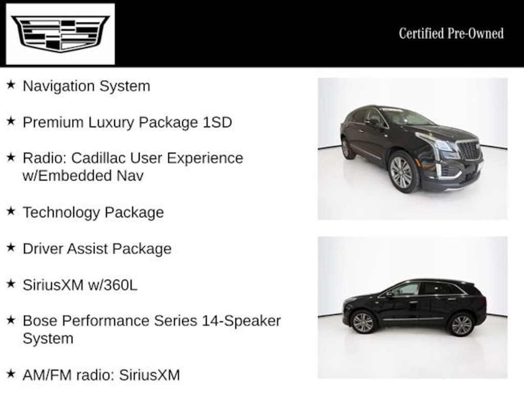 Certified. CARFAX One-Owner. Black Metallic 2024 Cadillac XT5 Premium Luxury AWD 9-Speed Automatic 3.6L V6 DI VVT XT5 Premium Luxury, 4D Sport Utility, 3.6L V6 DI VVT, 9-Speed Automatic, AWD, Black Metallic, Cirrus Leather, 2-Way Power Driver Lumbar Control Seat Adjuster, 2-Way Power Passenger Lumbar Control Seat Adjuster, 8 Color Driver Info Center Display Gauge Cluster, Adaptive Cruise Control, AM/FM radio: SiriusXM, Automatic Dual-Zone Climate Control, Automatic Emergency Braking, Automatic Parking Assist w/Braking, Automatic Seat Belt Tightening, Automatic Stop/Start w/Disable, Bodyside moldings, Bose Performance Series 14-Speaker System, Driver Assist Package, Dual Driver Info Center Display Gauge Cluster, Enhanced Automatic Emergency Braking, Front & Rear Park Assist, Front dual zone A/C, HD Rear Vision Camera, HD Surround Vision, Head-Up Display, Heated Driver & Front Passenger Seats, Heated front seats, Heated steering wheel, Inside Rear-View Auto-Dimming Mirror, Leather Seating Surfaces w/Mini Perforated Inserts, Navigation System, Power Liftgate, Power moonroof: UltraView, Premium Luxury Package 1SD, Radio: Cadillac User Experience w/Embedded Nav, Rear Camera Mirror, Rear Camera Mirror Washer, Rear Pedestrian Alert, Reverse Automatic Braking, SiriusXM w/360L, Split folding rear seat, Spoiler, Technology Package, Teen Driver, Voltmeter, Wheels: 20 6-Split Spoke Alloy, Wireless Apple CarPlay/Wireless Android Auto, Wireless Phone Charging.