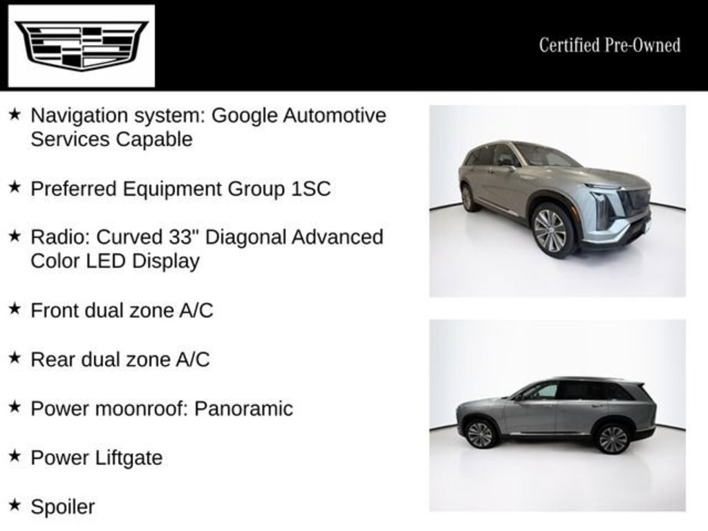 Certified. CARFAX One-Owner. Silver Metallic 2026 Cadillac VISTIQ Luxury AWD 1-Speed Automatic Electric ZEV 615hp VISTIQ Luxury, 4D Sport Utility, Electric ZEV 615hp, 1-Speed Automatic, AWD, Silver Metallic, Sheer Gray w/Inteluxe Seat Trim, 3rd row seats: bench, Driver 4-Way Power Lumbar Seat Adjuster, Driver 8-Way Power Seat Adjuster, Front dual zone A/C, Heated front seats, Heated rear seats, Heated steering wheel, Inteluxe Seat Trim, Navigation system: Google Automotive Services Capable, Power Liftgate, Power moonroof: Panoramic, Preferred Equipment Group 1SC, Radio: Curved 33 Diagonal Advanced Color LED Display, Rear dual zone A/C, Spoiler.